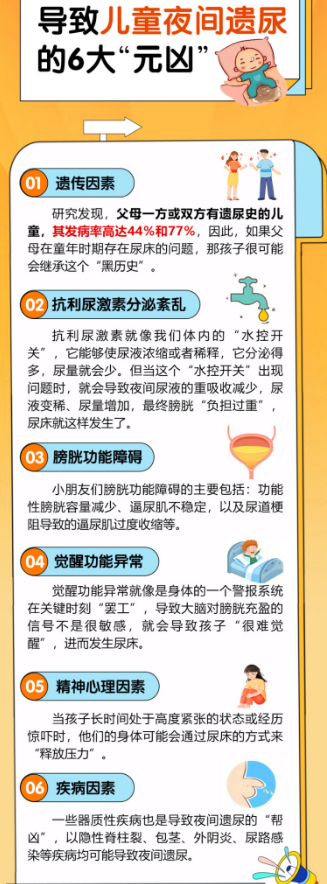 孩子总尿床?其背后的原因可不简单!儿童夜遗尿症可能与遗传因素、夜间抗利尿激素分泌不足、膀胱功能障碍、觉醒功能异常、精神心理因素等等有关!1遗传因素研究发现,父母一···