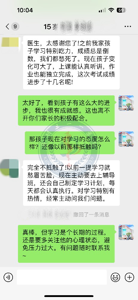 15岁男孩洋洋(化名)一上学就愁眉苦脸,学习吃力,作业漏洞百出,成绩班里垫底,给孩子报辅导班孩子也不去,家长束手无策...来院经过2个疗程的综合治疗,洋洋不仅对上学不再抵触,考试也进步了十几名,妈妈说孩子现在对学习特别有热情,性格也开朗了许多!